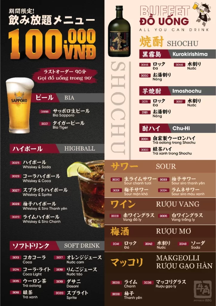 🍹 Menu đồ uống: Bia Sapporo, Highball, Shochu, Soft Drink…